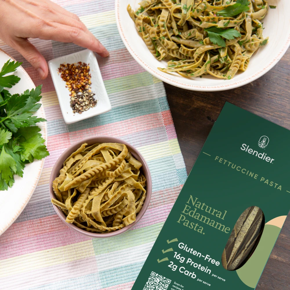 Whether topped with Slendier’s Organic Italian Pasta Sauces or your own recipe creations, Edamame Fettuccine holds its texture and soaks up flavor beautifully. Quick to prepare and easy to love, it’s a wholesome upgrade to your pasta night.